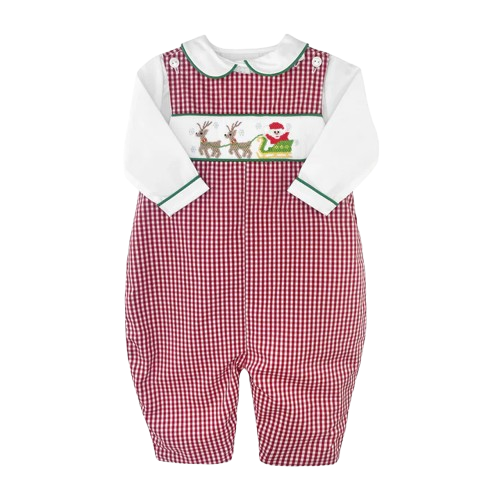 This long sleeve romper comes in a red and white check fabric with a hand picture smocked scene of Santa's sleigh with his reindeer. A white peter pan collar with green picot trim completes the look.